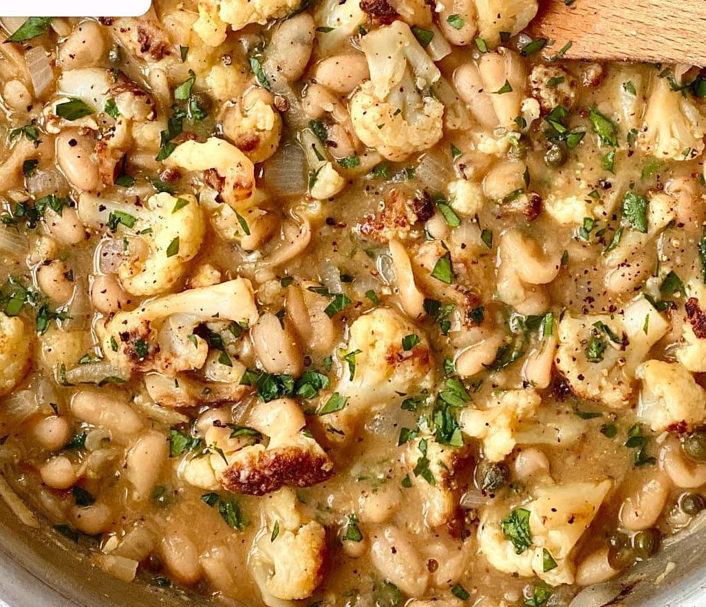 Braised white beans and cauli in a light lemony piccata sauce with with broccolini and herby roast potatoes with caesar aioli. GF/RSF/DF