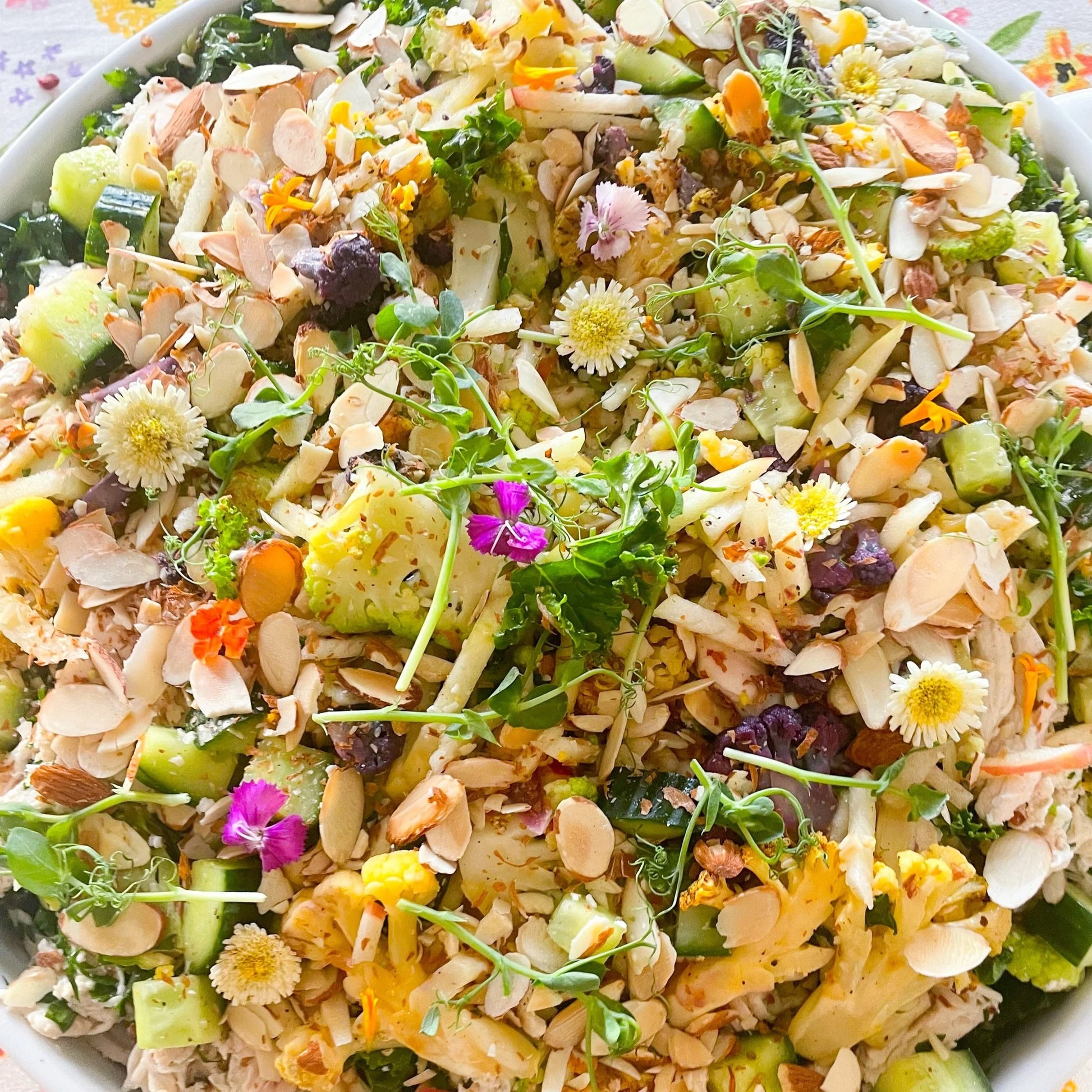 Massaged Kale, Shredded Snap Peas, Green Crown Leaf, Cucumber, Red Quinoa, Toasted Almonds, Feta, Roasted Multi-Colored Cauliflower, Apple Matchsticks, Herbs, Charred Leek Vinaigrette. Shredded Herbed Chicken.